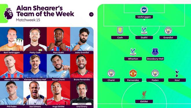 英超官方發(fā)布了阿蘭-希勒評(píng)選的英超第15輪最佳陣容,?;倏恕⒏5?、布魯諾-費(fèi)爾南德斯、哈維-西蒙斯等人在列。